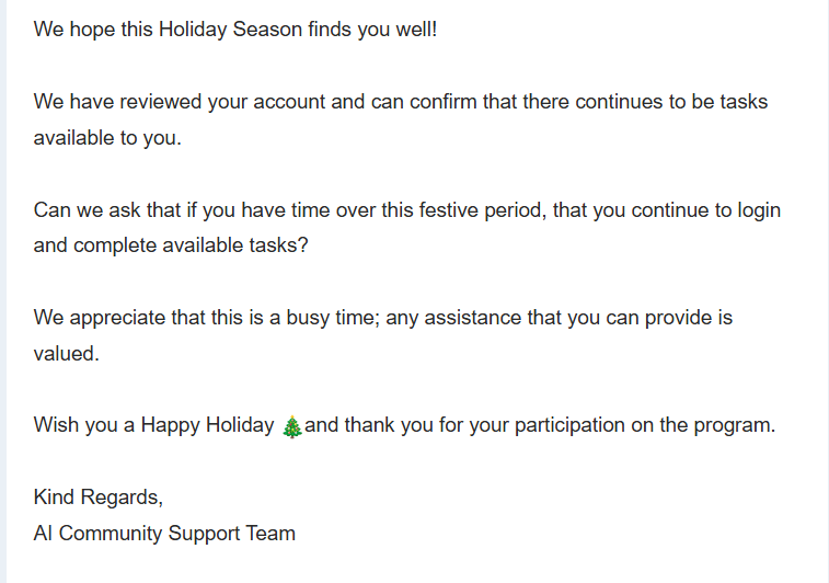 And every rater got this email to remind us that there's nothing wrong with our accounts, we should have access to tasks, and we needn't worry about NTA looming. If you believed this, then please watch this video.